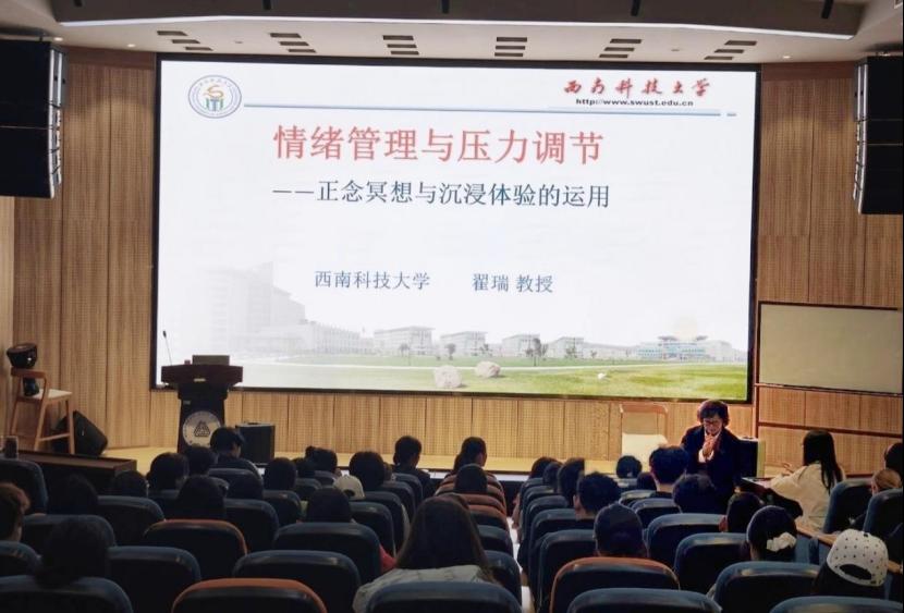 为进一步加强大学生心理健康教育,提升心理委员专业素养与朋辈互助能力,引导学生科学管理情绪、有效调适压力,3月20日下午两点半,大学生心理健康教育与发展服务中心在游仙校区书院会堂成功举办《情绪管理与压力调适—正念冥想体验与运用》专题心理讲座。本次讲座特邀学校特聘心理专家、西南科技大学翟瑞教授主讲,游仙校区近90名班级心理委员参加培训。